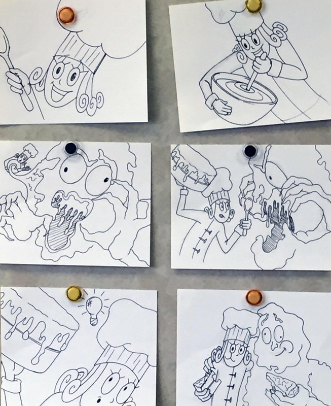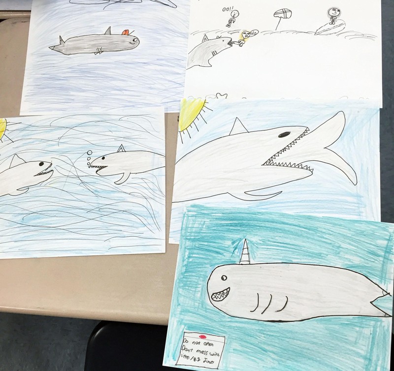 To practice the story elements they were learning, the students created a St. Patrick’s Day storyboard as a whole class. Next, the students worked in small groups to create original storyboards. The storyboarding activity helped to reinforce the legend’s story elements. The groups chose storyboard subjects, such as sharks, dogs, monsters and more (below).